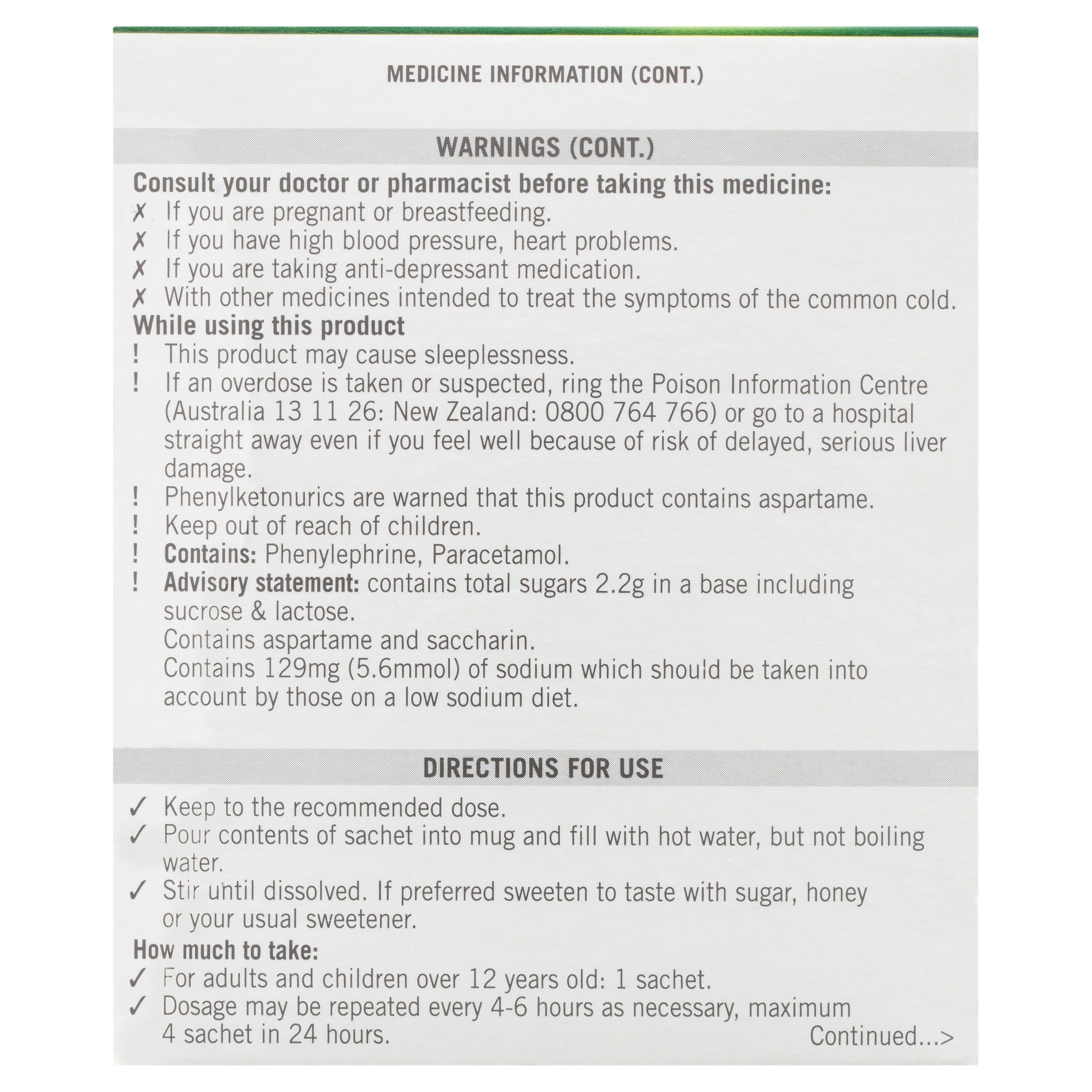CONTAINS PARACETAMOL. If an overdose is taken or suspected, ring the Poisons Information Centre (Australia 13 11 26; New Zealand 0800 764 766) or go to a hospital straight away even if you feel well because of the risk of delayed, serious liver damage. Do not take with other products containing paracetamol, unless advised to do so by a doctor or pharmacist. CONTAINS PHENYLEPHRINE. See your doctor before taking this medicine if you are pregnant, have high blood pressure or heart problems or are taking antidepressant medication. Sachet safety sealed - do not use if torn or damaged. PHENYLKETONURICS: CONTAINS PHENYLALANINE.
