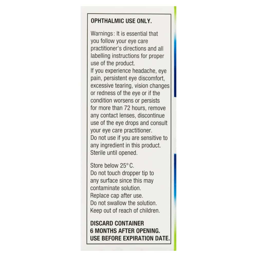 It is essential that you follow your eye care practitioner's directions and all labelling instructions for proper use of the product. If you experience headache, eye pain, persistent eye discomfort, excessive tearing, vision changes or redness of the eye or if the condition worsens or persists for more than 72 hours, remove any contact lenses, discontinue use of the eye drops and consult your eye care practitioner. Do not use if you are sensitive to any ingredient in this product. Sterile until opened.